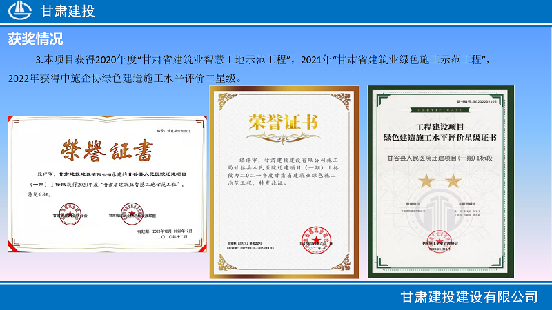 此前該項(xiàng)目還授權(quán)發(fā)明專利2項(xiàng)、實(shí)用新型專利1項(xiàng),獲評(píng)省級(jí)工法1項(xiàng),獲得省、市級(jí)文明工地、甘肅省建筑業(yè)智慧工地示范工程、甘肅省建筑業(yè)綠色施工示范工程、綠色建造施工水平評(píng)價(jià)二星級(jí)、首屆(2020)全國(guó)數(shù)字項(xiàng)目大獎(jiǎng)賽二等獎(jiǎng)等獎(jiǎng)項(xiàng)。