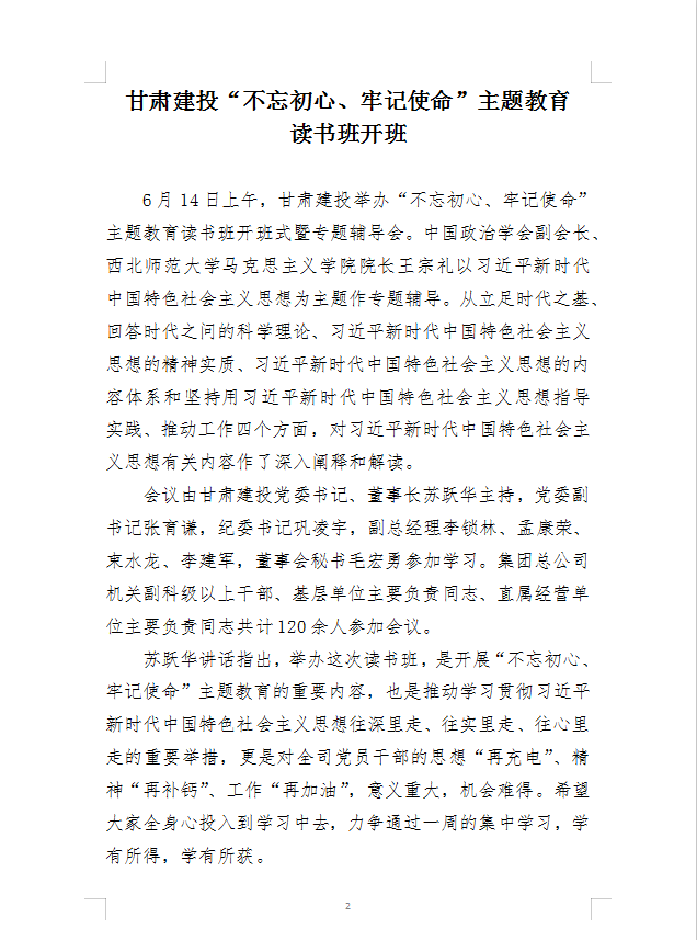 【不忘初心 牢記使命】甘肅建投“不忘初心、牢記使命”主題教育讀書班開班